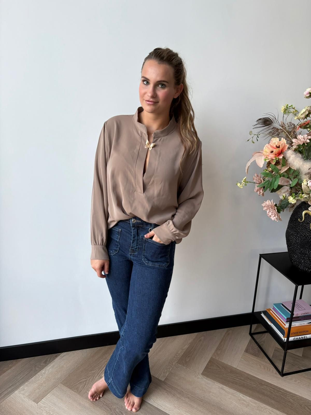 Elegante beige blouse/tuniek met een prachtige goudkleurige afneembare  gouden vlinder broche als eyecatcher.