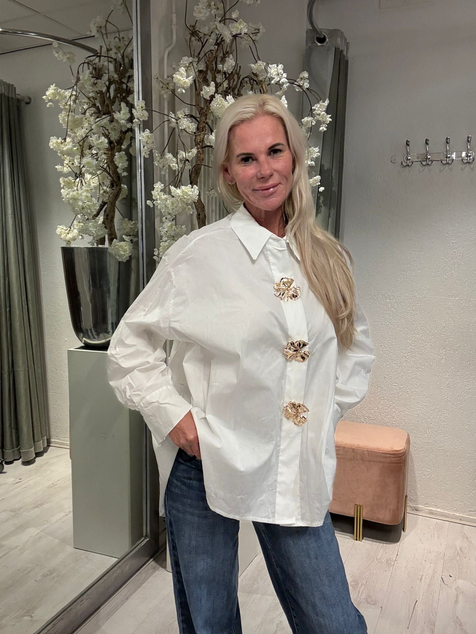 De gouden bloem knopen geven deze blouse een luxe uitstraling en maken elke outfit compleet. Een must-have voor je garderobe!
