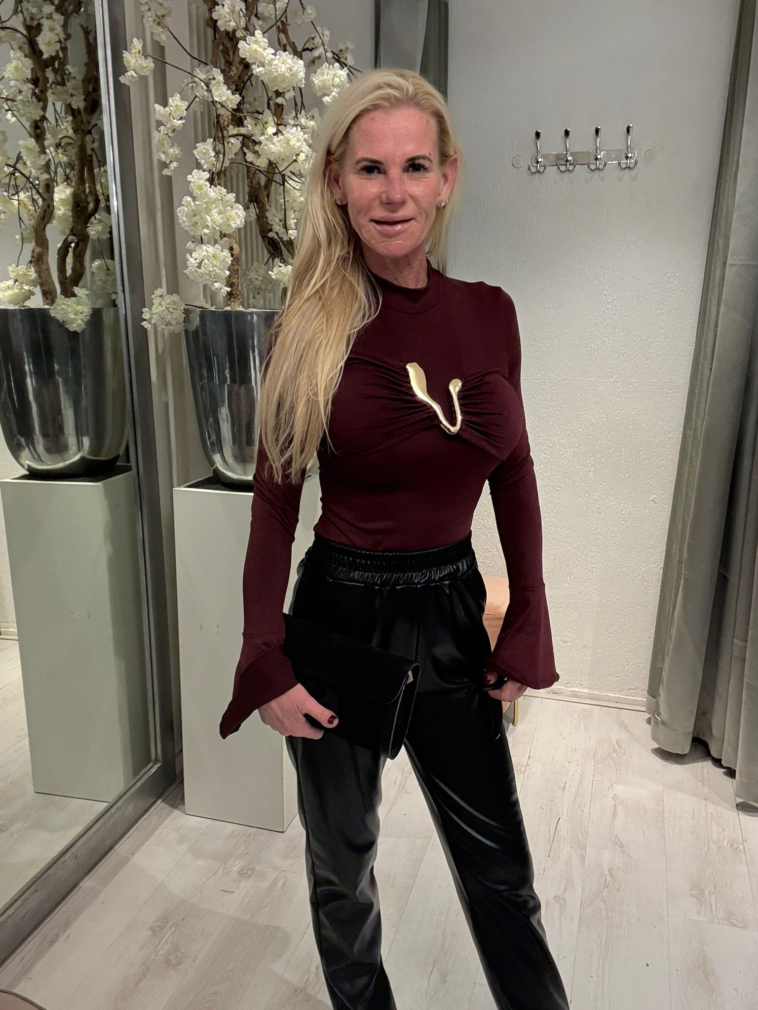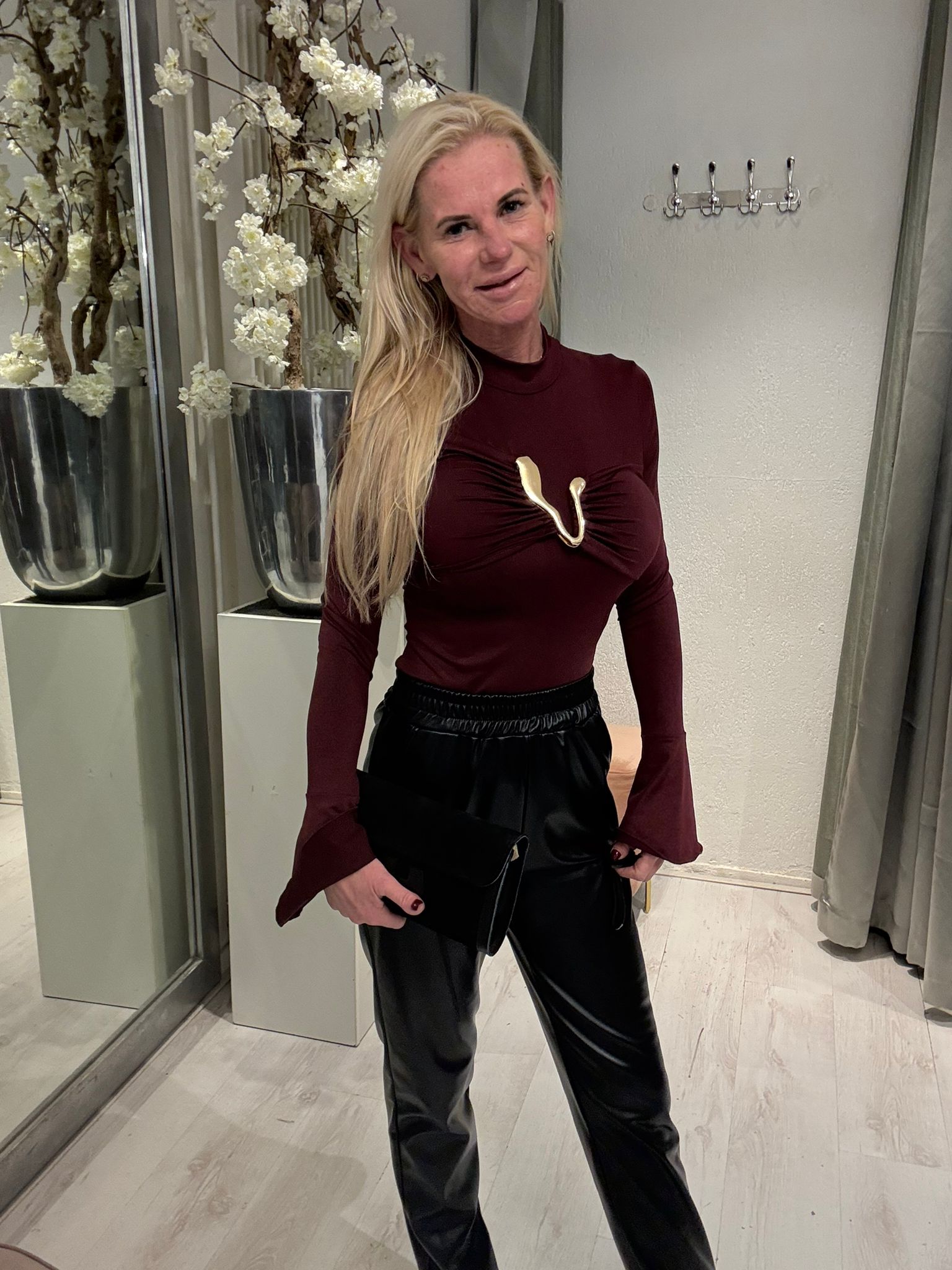 Elegante bordeaux body Aphrodite met wijdlopende mouwen en een unieke gouden gesp in het midden bij de borst. Deze luxe body combineert verfijning met een opvallend detail voor een stijlvolle look.