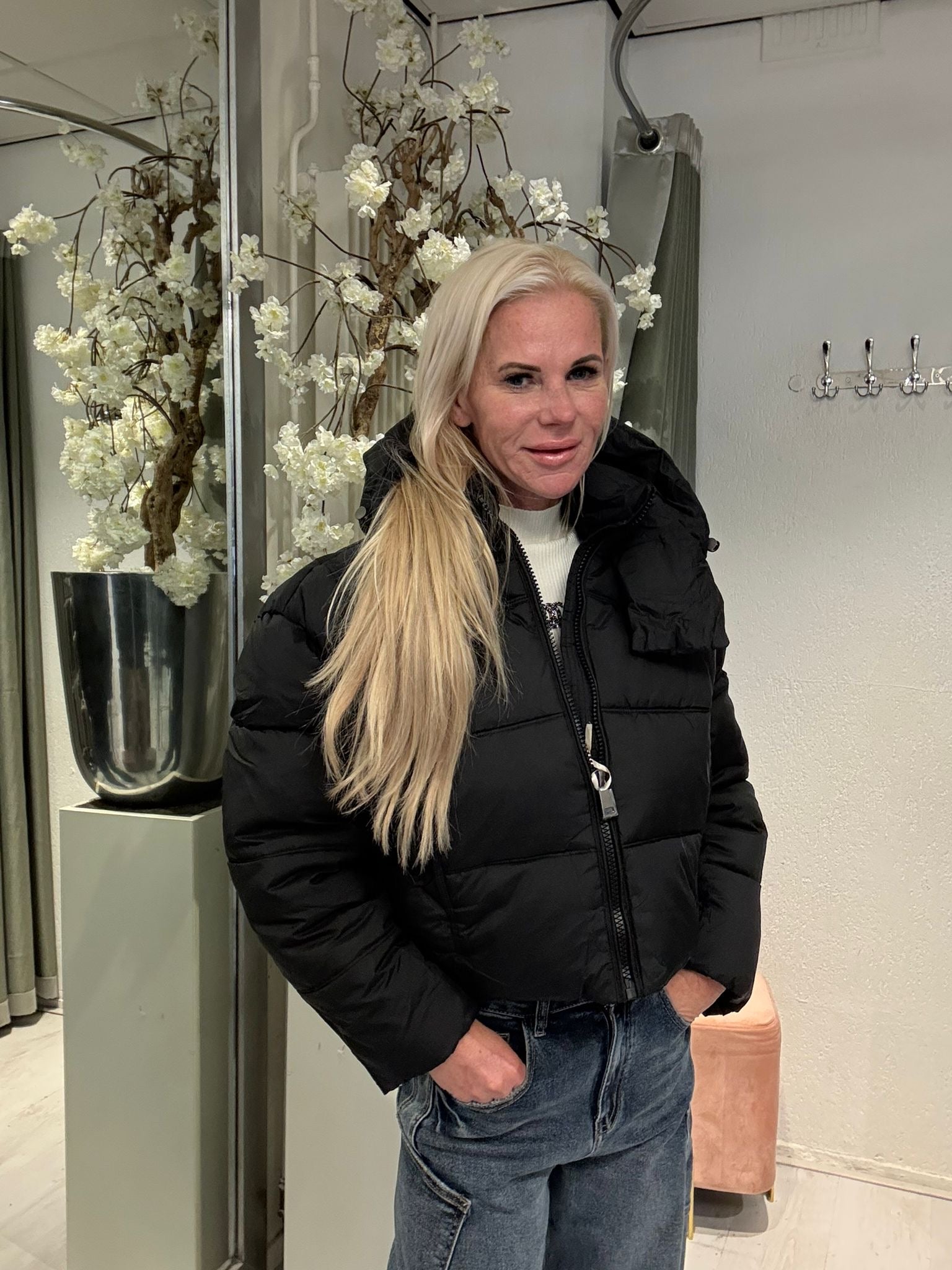 Stella draagt maat S en is 172 cm lang - deze jas valt perfect en geeft een flatterende, moderne silhouet. Het korte model is ideaal voor vrouwen die van een trendy, eigentijdse look houden zonder de functionaliteit van een winterjas op te geven.