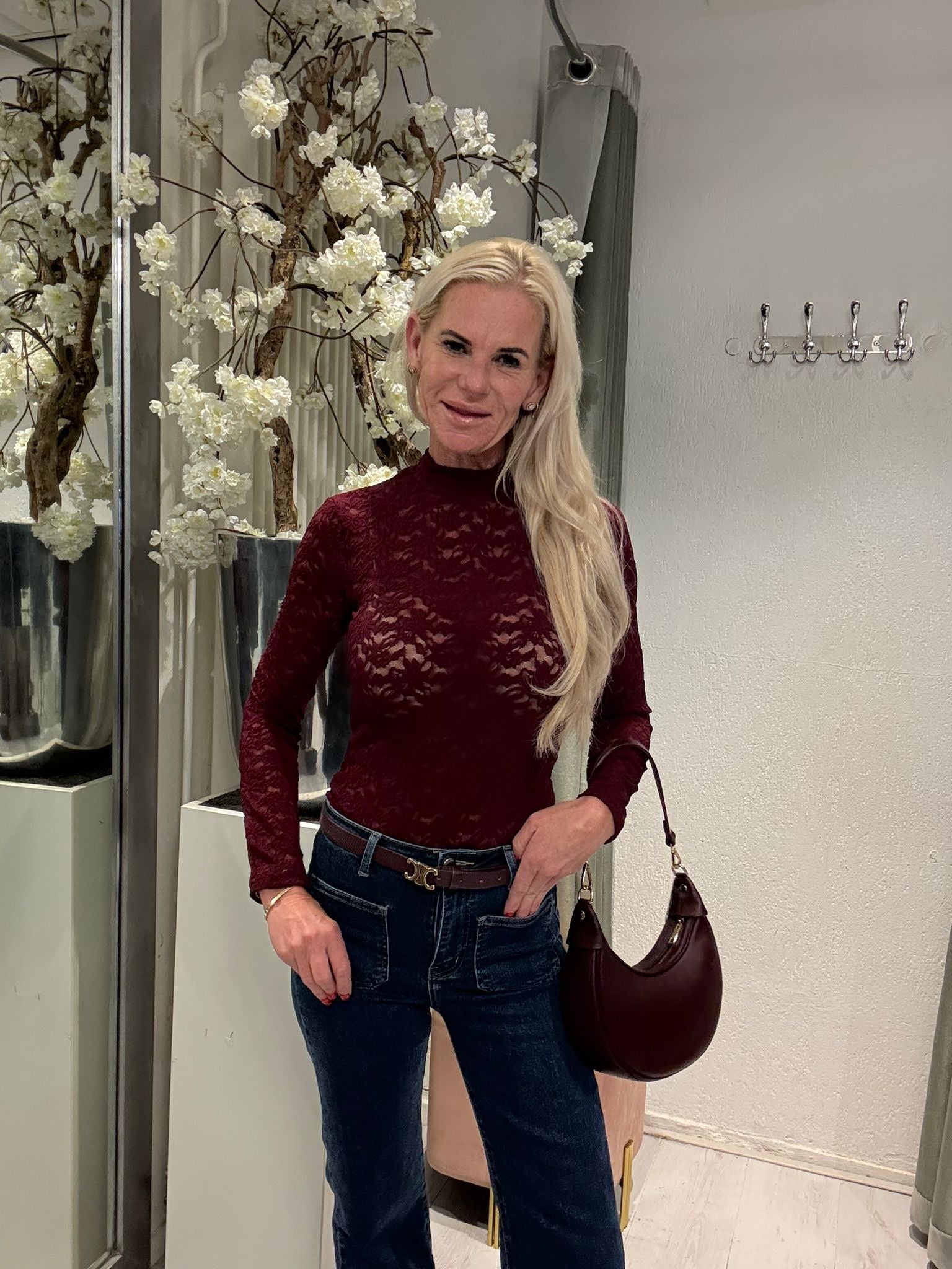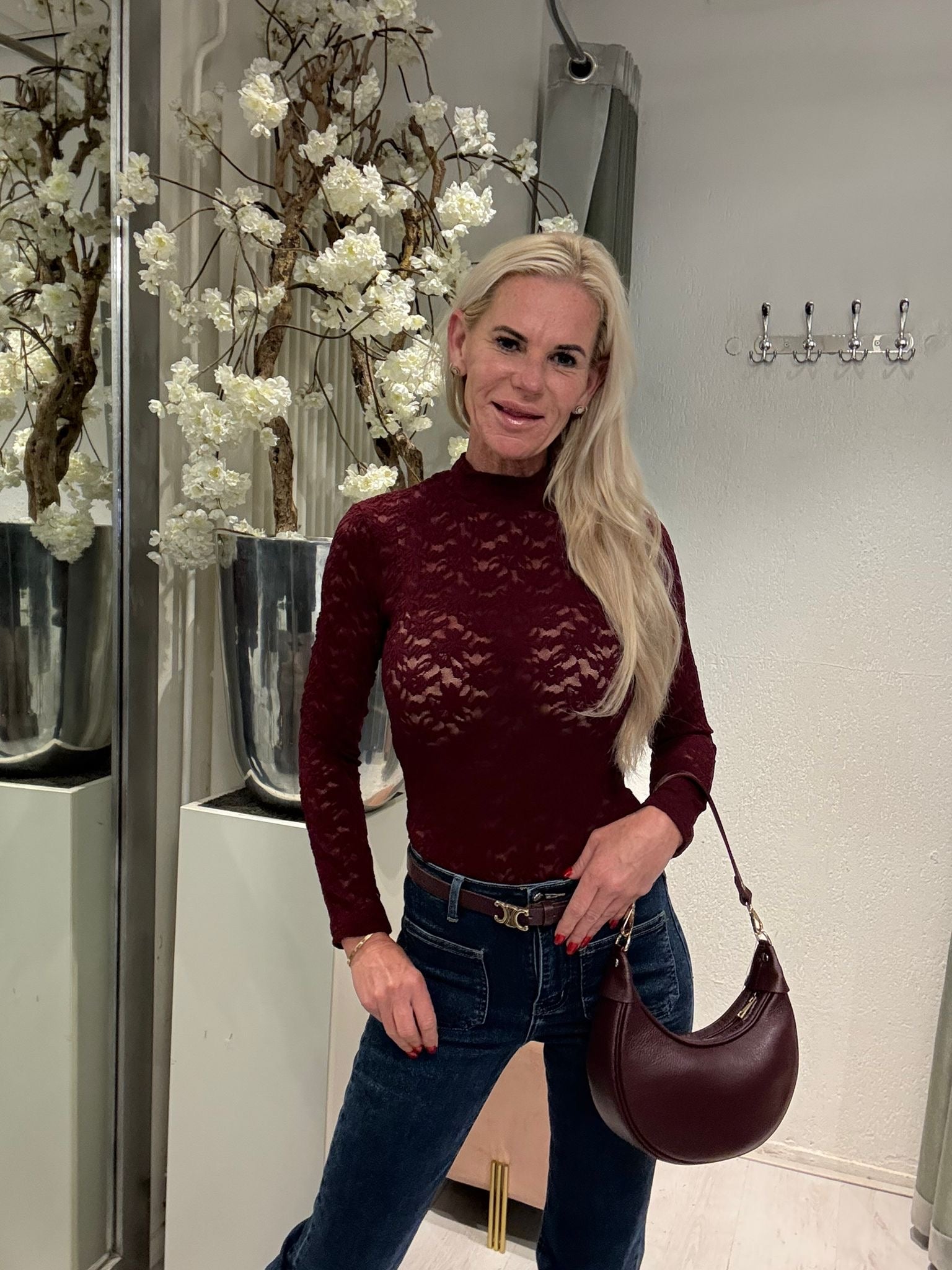 Deze prachtige kanten top in bordeauxrode kleur is de perfecte keuze voor wie houdt van verfijnde details en tijdloze elegantie. De top is volledig gemaakt van delicaat kant dat zorgt voor een romantische en vrouwelijke uitstraling.