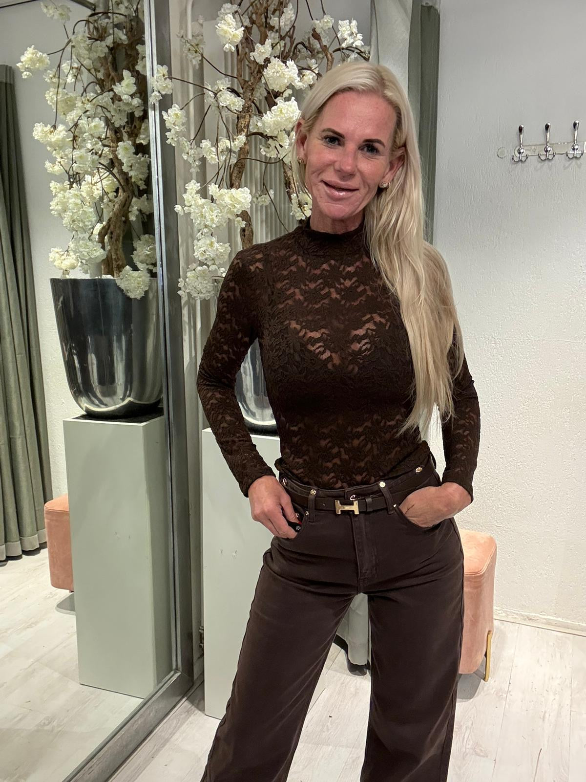 Deze prachtige kanten top in chocoladebruine kleur straalt warmte en verfijning uit. De rijke, diepe bruintinten geven deze top een luxueuze uitstraling die perfect is voor elke gelegenheid waar je indruk wilt maken.