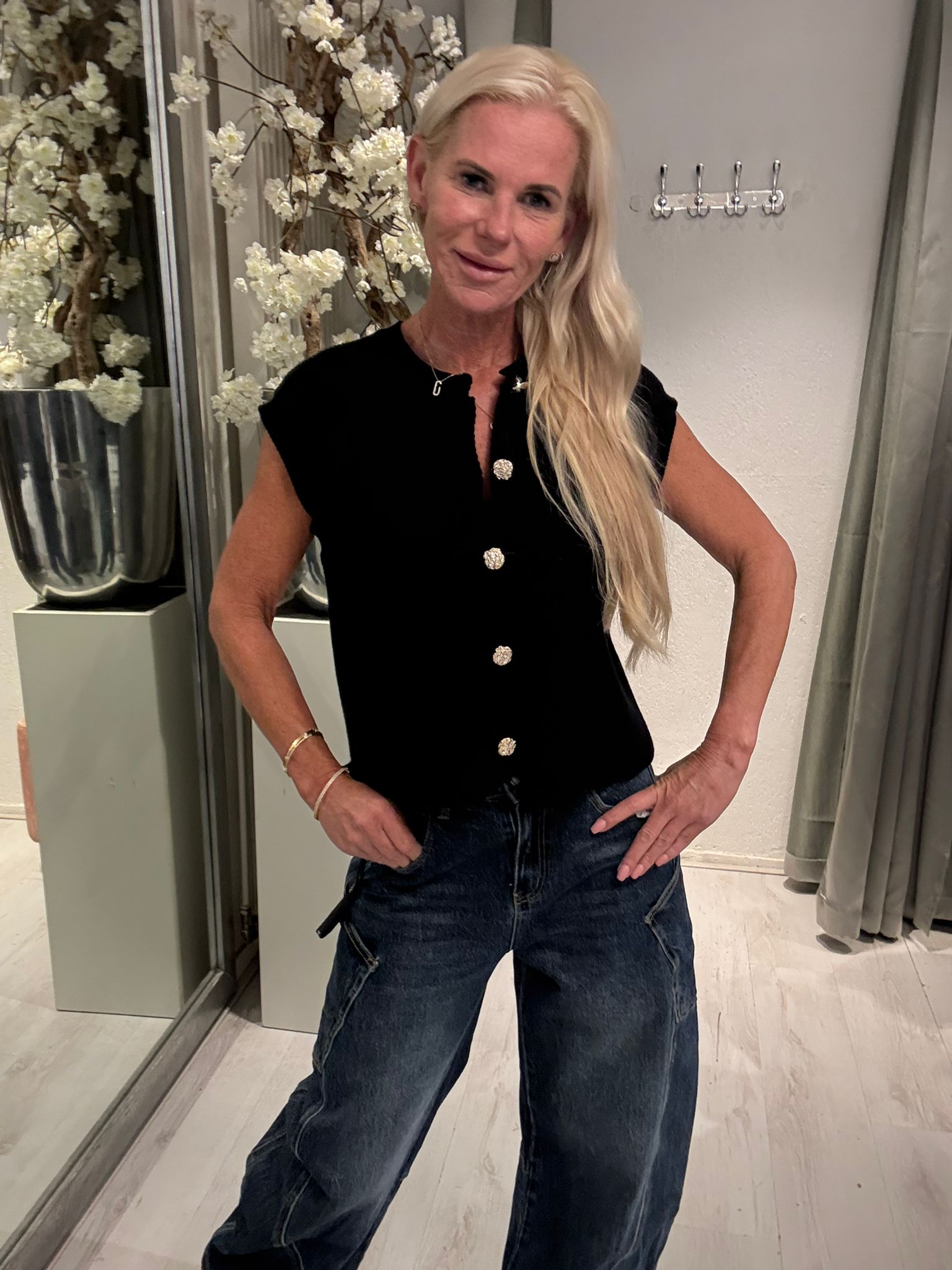Elegante gebreide zwarte gilet top . Deze mouwloze top heeft een comfortabele pasvorm en is perfect voor layering of solo dragen. One size - past tot maat 40.